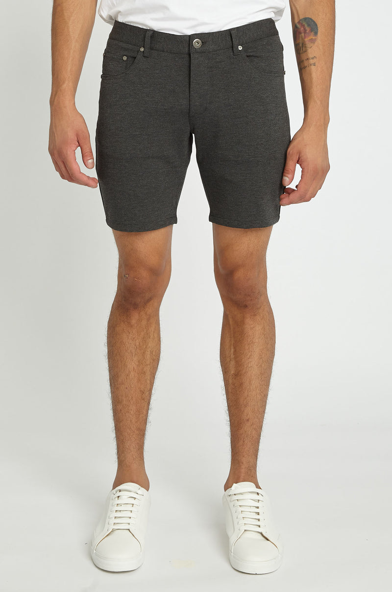These Pewter 5-pocket stretch knit jeans shorts are cut slim for an enhanced, flattering silhouette. Features our engineered curved, stretch waistband with belt loops, metal rivets, zip fly and signature logo metal button closure. Fabricated from an ultra-soft, 4-way stretch knit fabric for maximum comfort and performance. The unique fabric knit structure has a soft hand feel and excellent shape recovery with a lot of stretch for a perfect fit. Inseam length is 8".