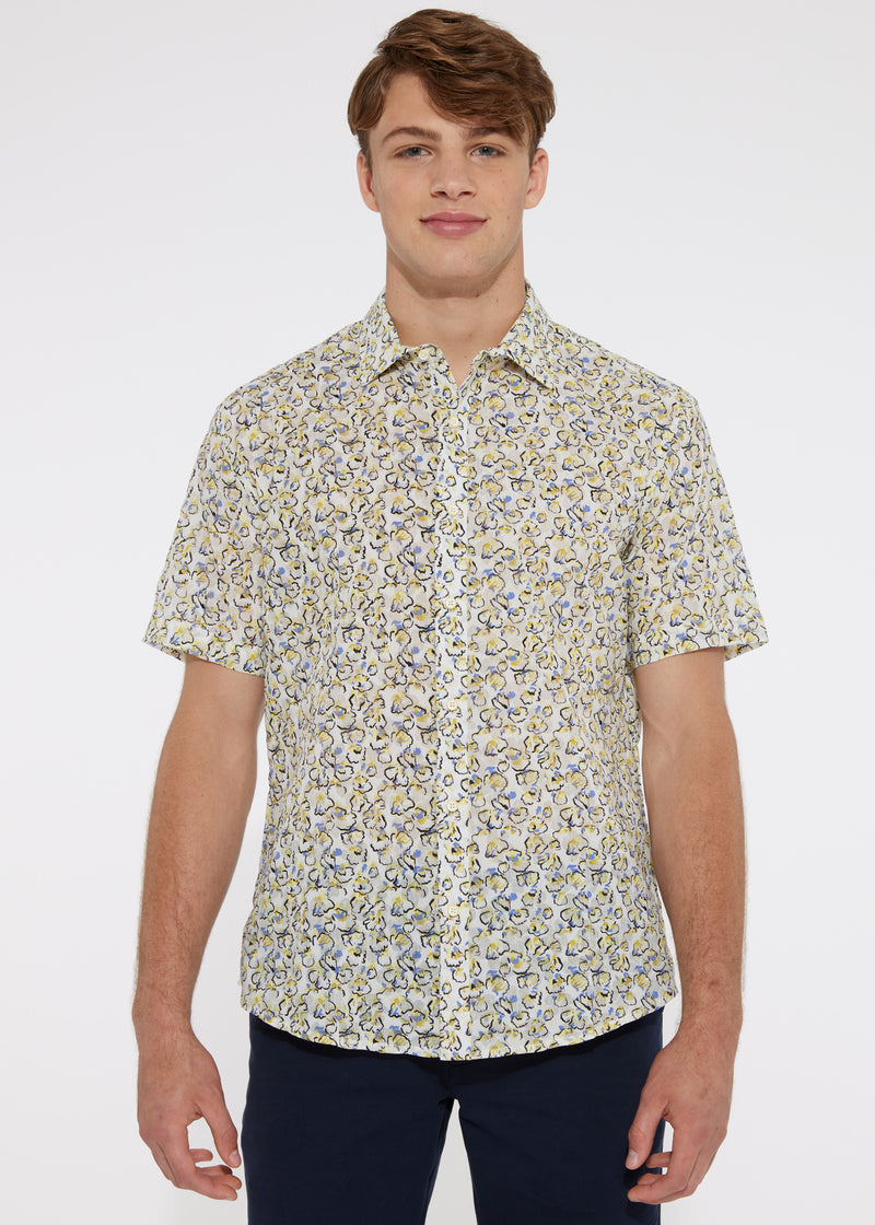 Yellow and white scribble floral print short sleeve woven cotton shirt featuring a pointed collar, front button placket, a curved hem and tailored for a slim fit. Made from a sheer lightweight and breathable cotton seersucker fabric.